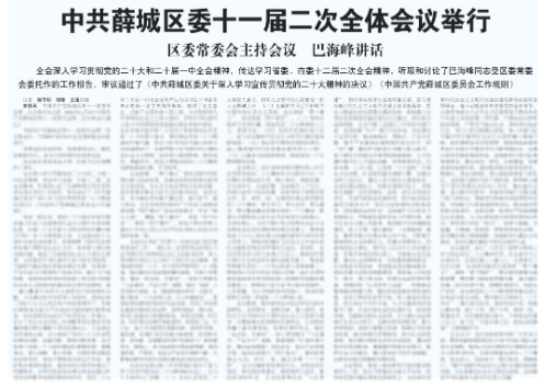 全会深入学习贯彻党的二十大和二十届一中全会精神,传达学习省委、市委十二届二次全会精神,听取和讨论了巴海峰同志受区委常委会委托作的工作报告,审议通过了《中共薛城区委关于深入学习宣传贯彻党的二十大精神的决议》《中国共产党薛城区委员会工作规则》